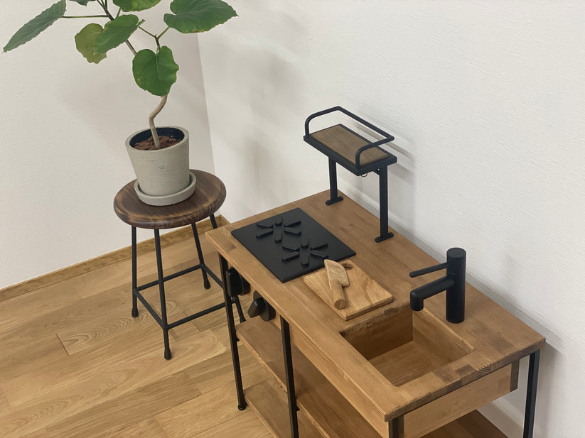 単純な遊びとしてだけではなく、子どもの社交性や想像力、言語力を育むものとして、昔から親しまれてきた「おままごと」。木製のキッチンは人肌のようなぬくもりで、子どもが安心して触れることができます。