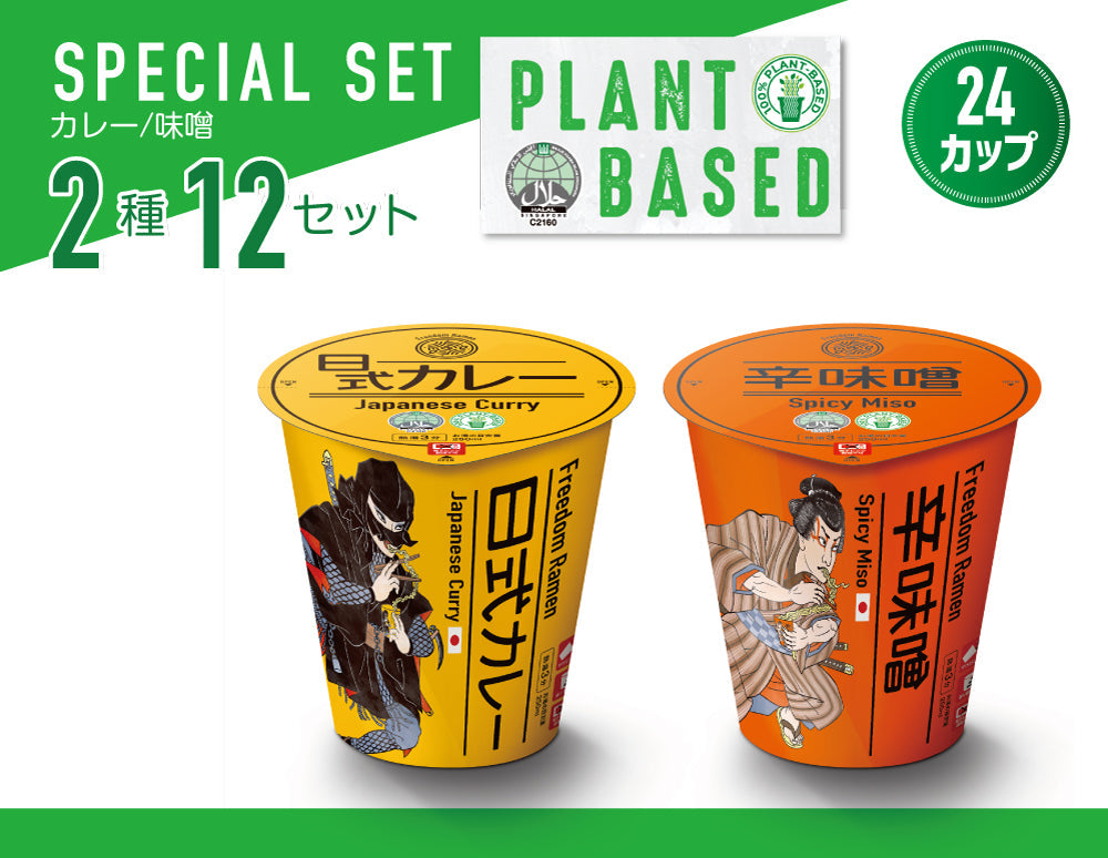 HALAL+100%植物性のカップ麺、日式カレー味と辛味噌味を各12食ずつセットにしました。